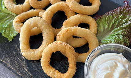 Nuggetsy z kurczaka 5 szt., krążki cebulowe 5 szt., grzanki czosnkowe 2 szt.,
