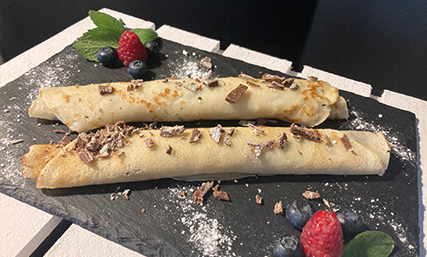 Nuggetsy, frytki lub cząstki ziemniaków, marchewki, cząstki jabłka, ketchup