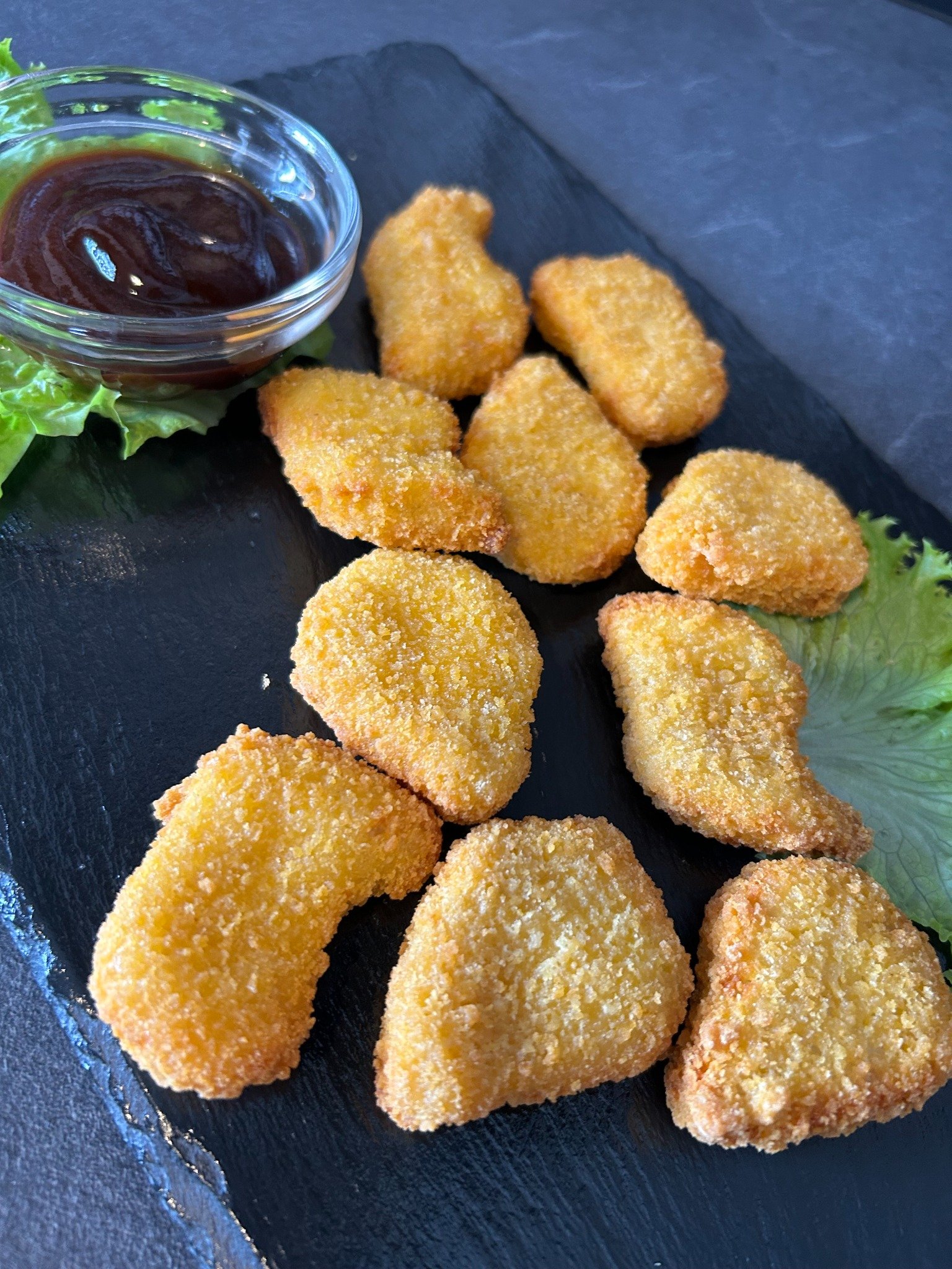 Nuggetsy z kurczaka 5 szt., krążki cebulowe 5 szt., grzanki czosnkowe 2 szt.,