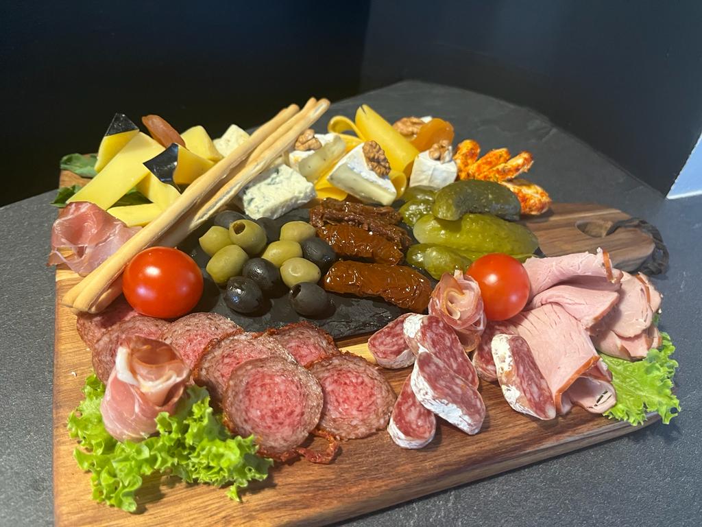 Nuggetsy z kurczaka 5 szt., krążki cebulowe 5 szt., grzanki czosnkowe 2 szt., trójkąty sera camembert 3 szt., z dipem czosnkowym i barbecue